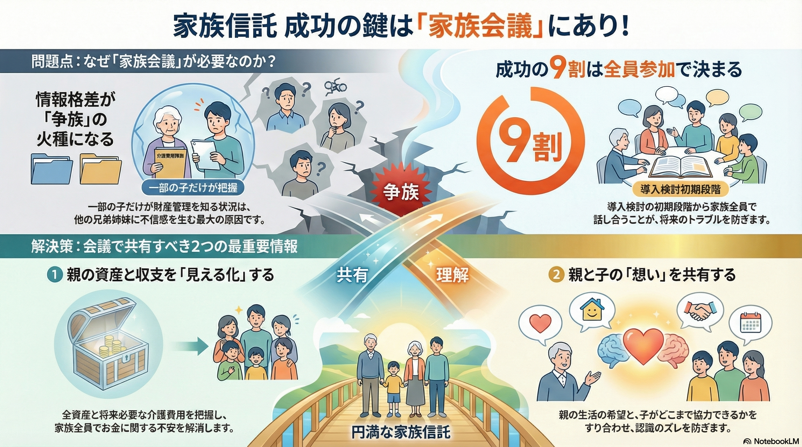 家族信託は、親(委託者)と子(受託者)の二者間の契約ですが、導入を成功させる鍵は「家族全員の理解と合意」にあります。